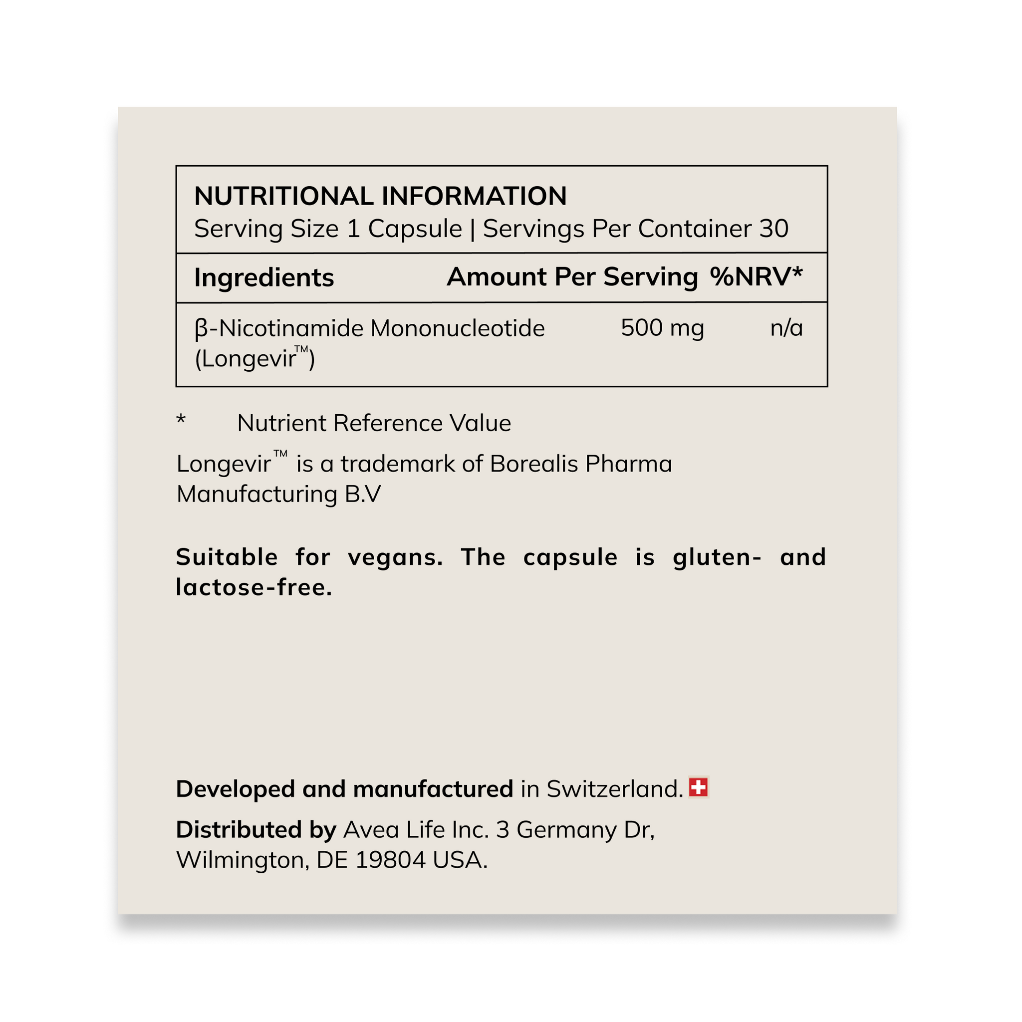 AVEA uses Longevir™ NMN, produced in Europe and double tested independently in a Swiss lab to ensure the highest purity, stability, and quality.