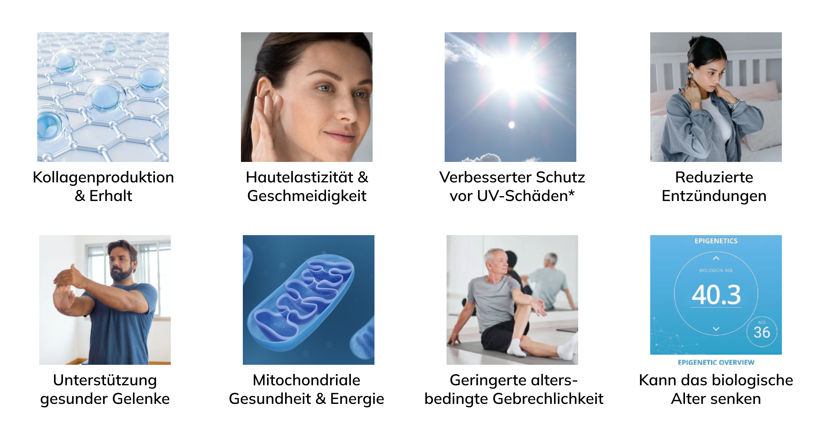Die Steigerung der Kollagenproduktion in deinem Körper hat enorme Vorteile für deine Haut, Gelenke, Knochen und Muskeln; doch die Auswirkungen unserer Formulierung auf deine Gesundheit gehen über Kollagen hinaus.