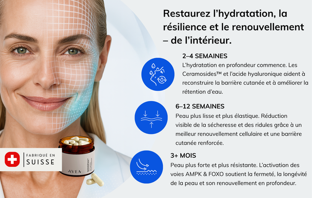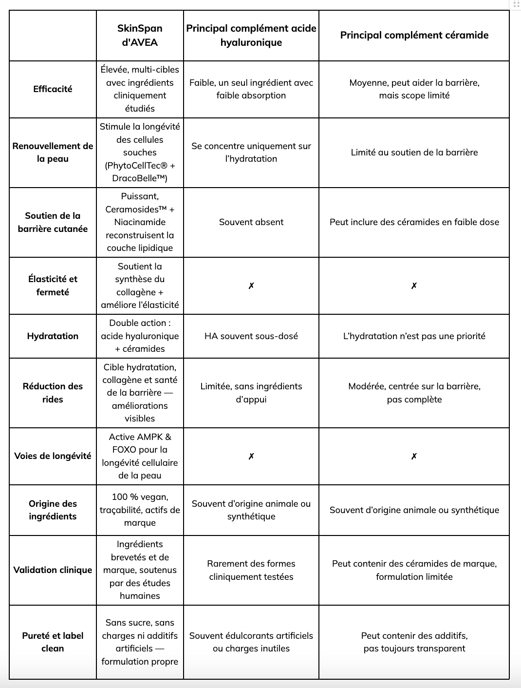 Pas seulement « acide hyaluronique » ou « céramides », mais des formes spécifiques, validées par des études humaines, qui ont démontré leur efficacité pour améliorer l’hydratation, l’élasticité de la peau ou la réparation de la barrière. Par exemple, Ceramosides™ (céramides d’origine végétale) ou l’acide hyaluronique à des doses cliniquement efficaces (~120–240 mg par jour).