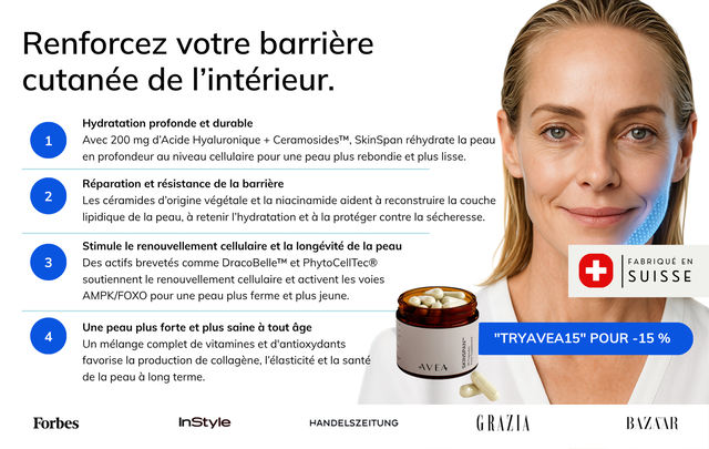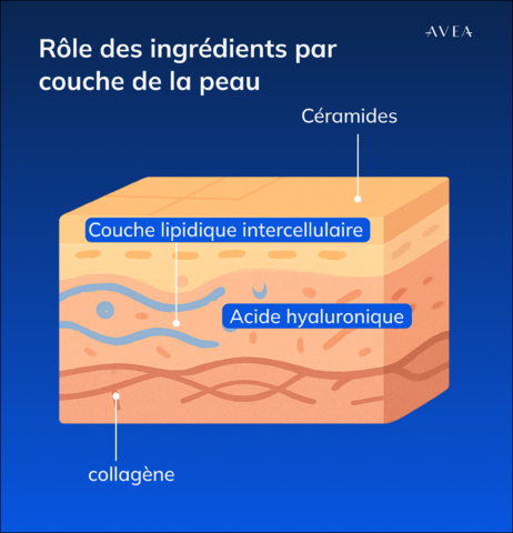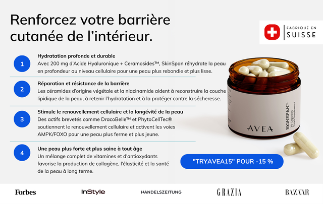 Recherchez une matrice complète : des antioxydants (comme la vitamine C) qui protègent le collagène, des céramides qui renforcent la matrice lipidique, de la niacinamide pour soutenir la barrière cutanée, ainsi que des activateurs de longévité (comme DracoBelle™ ou PhytoCellTec®) qui stimulent le renouvellement cutané de l’intérieur.