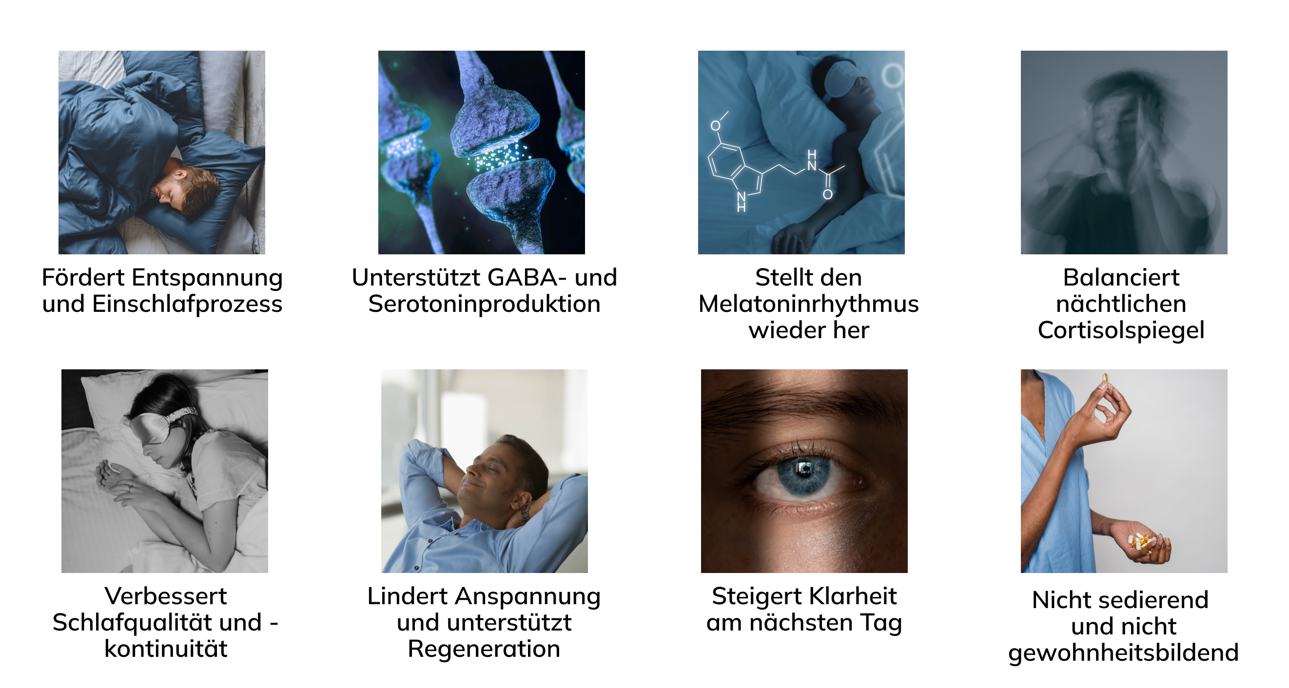 Die nicht sedierende Formel vermeidet Morgenmüdigkeit und Abhängigkeit, während Serezin™ in klinischen Studien gezeigt hat, dass es das Aufwachen erleichtert und die mentale Klarheit am Morgen verbessert.