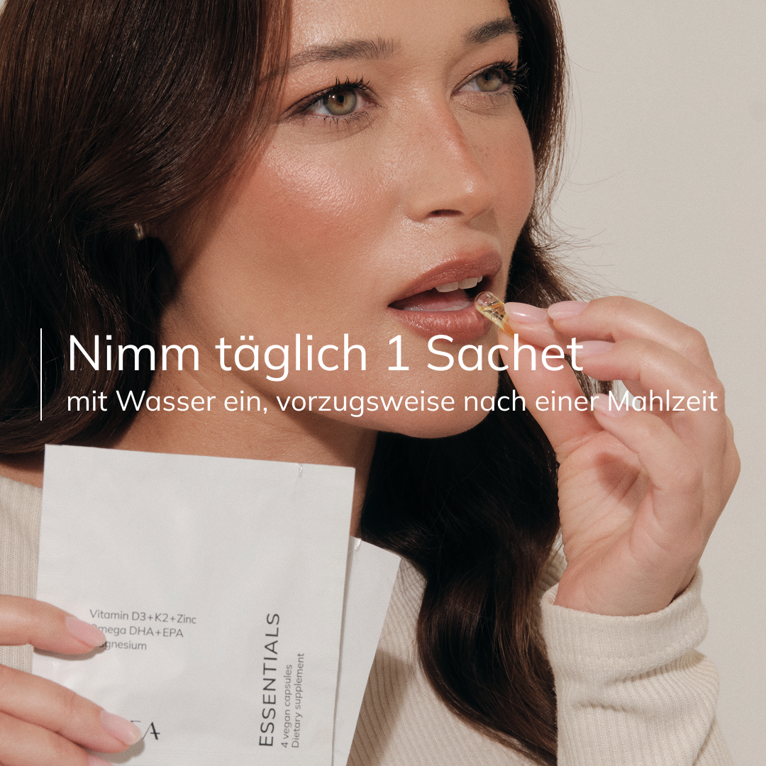 Die Essentials vereinen sechs wichtige Nährstoffe, die in modernen Ernährungsweisen oft zu kurz kommen: Vitamin D3, K2, Omega-3, Magnesium, Zink und einen Vollspektrum-B-Komplex – um zentrale Nährstofflücken zu schließen und deine langfristige Gesundheit zu fördern.