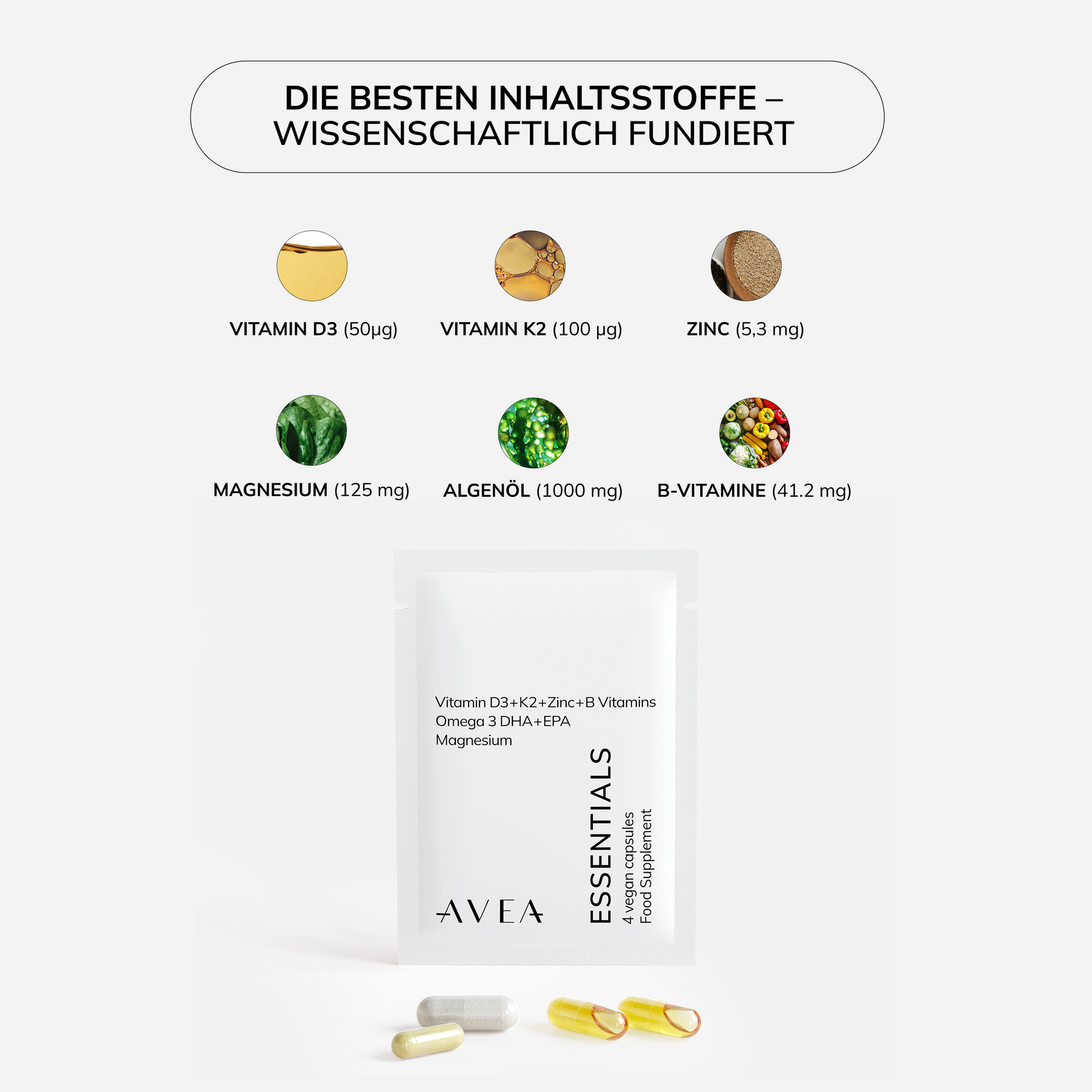 AVEA’s Essentials kombinieren sechs essenzielle Mikronährstoffe in einem praktischen Tagespack, um genau diese Synergien zu ermöglichen – in der richtigen Menge und optimal aufeinander abgestimmt.