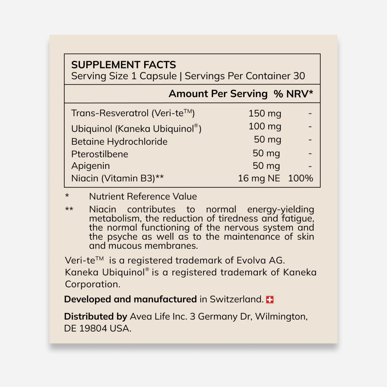 Aktive Inhaltsstoffe: Veri-te™ Trans-Resveratrol 150 mg, Kaneka Ubiquinol® (Coenzym Q10) 100 mg, Betain Hydrochlorid 50 mg, Pterostilben 50 mg, Apigenin 50 mg, Nicotinamid (Vitamin B3) 16 mg
