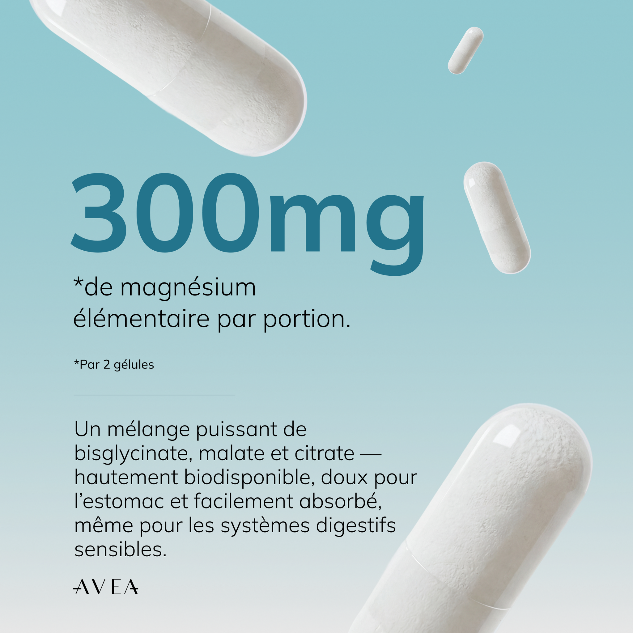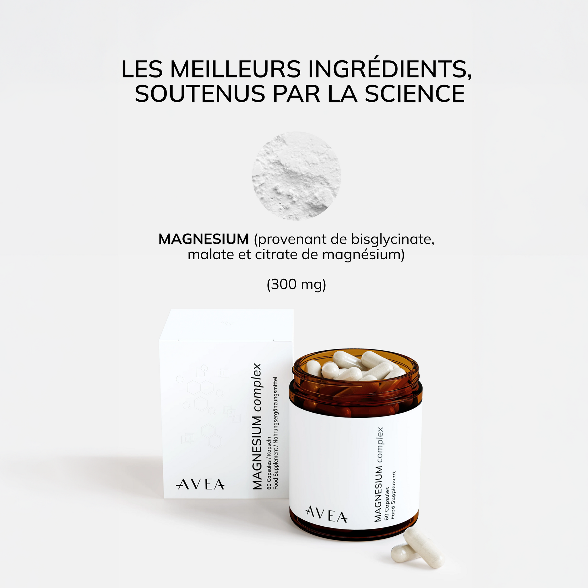 Le magnésium joue un rôle central dans la régulation du système nerveux, la relaxation musculaire et la production d'énergie cellulaire. Pourtant, de nombreuses personnes n'atteignent pas un apport optimal en magnésium en raison des habitudes alimentaires modernes, du stress et d'une demande physiologique accrue. Nous avons conçu le Complexe de Magnésium d'AVEA pour soutenir les principales voies biologiques dans lesquelles le magnésium joue le rôle le plus important : la régulation du système nerveux, la récupération musculaire, le métabolisme énergétique et l'équilibre digestif. En combinant plusieurs formes de magnésium hautement biodisponibles, la formule favorise la disponibilité du magnésium dans différents tissus et fonctions physiologiques.