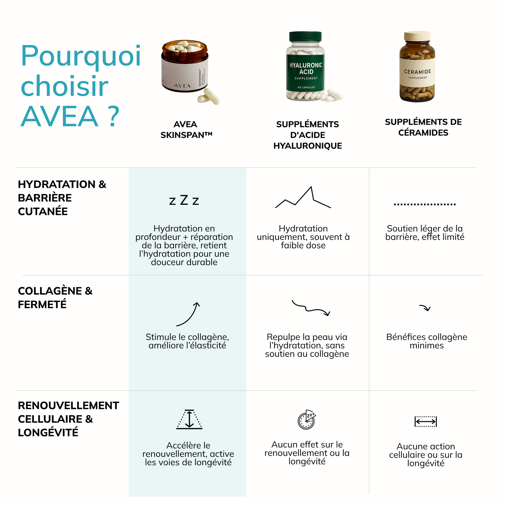 SkinSpan™ est une formule scientifique qui ne se contente pas d'hydrater, mais qui renforce également la capacité de régénération de votre peau. Contrairement aux mélanges conventionnels qui se concentrent sur l'hydratation superficielle ou sur des ingrédients isolés, chaque ingrédient de SkinSpan™ a été soigneusement sélectionné, dosé avec précision et cliniquement testé pour agir en synergie, favorisant ainsi une amélioration visible de la fermeté, de la douceur et de la résilience de la peau au fil du temps.