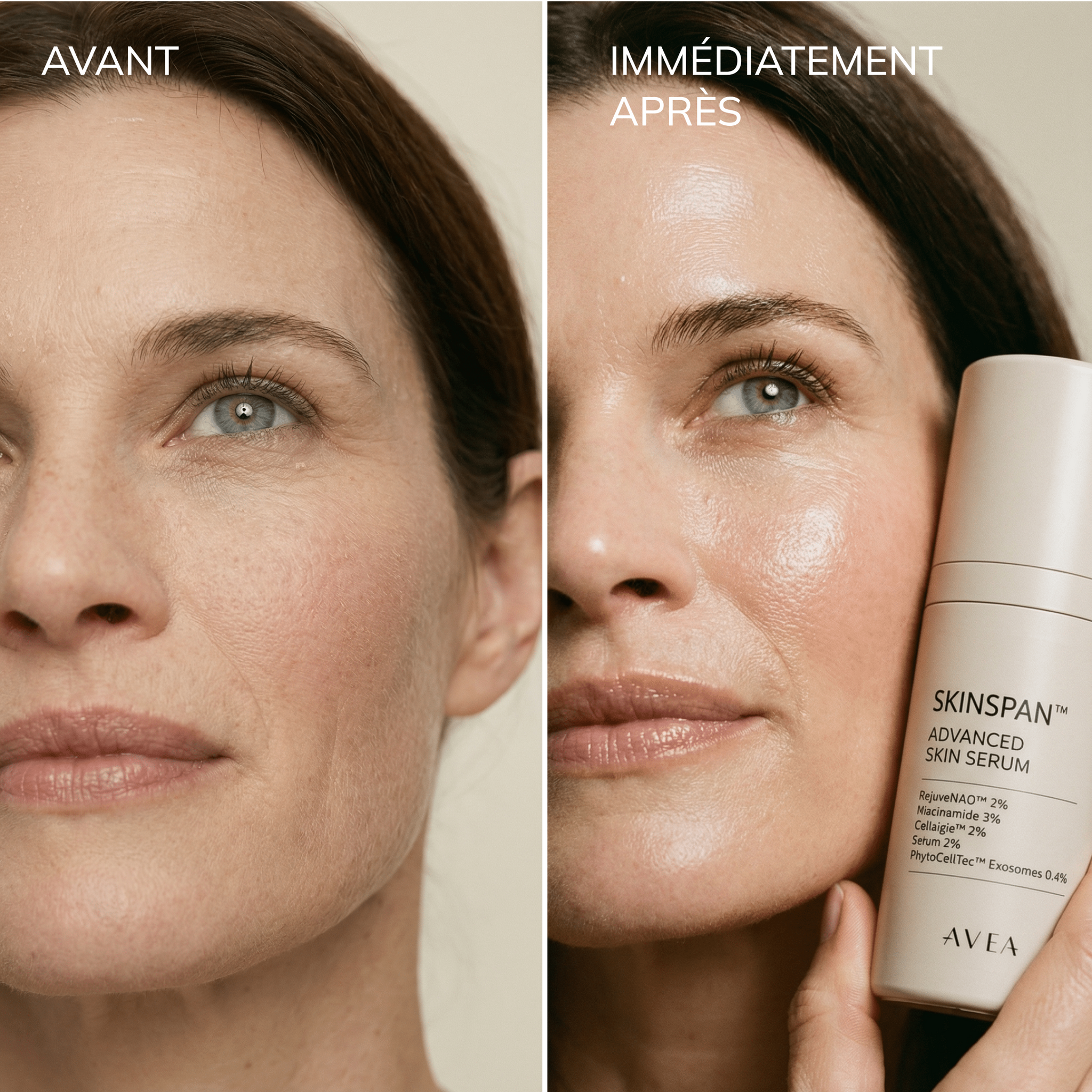 Contrairement aux sérums conventionnels ou même à d'autres sérums axés sur la longévité, le sérum SkinSpan™ Advanced Skin Serum ne repose pas sur un seul ingrédient « vedette ». Sa formulation reflète une approche systémique du vieillissement cutané, ce qui permet d'obtenir des résultats cumulatifs au fil du temps.