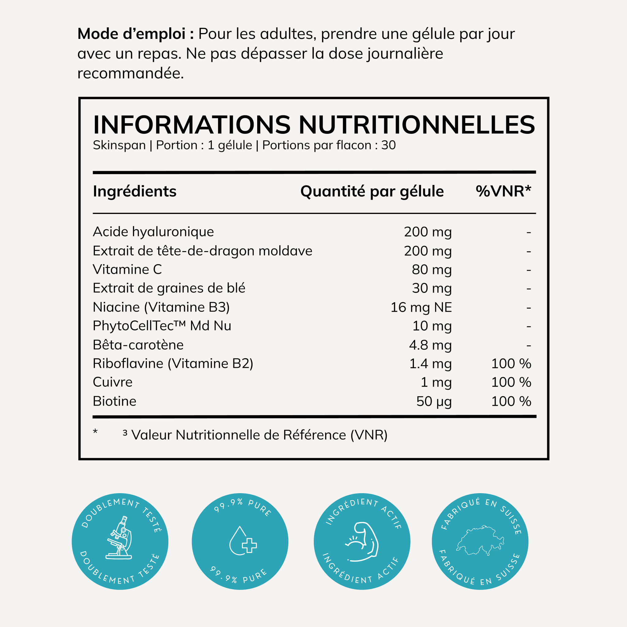 INGRÉDIENTS DES CAPSULES DE COMPLÉMENT : Acide hyaluronique 200 mg, extrait de tête de dragon moldave (DracoBelle™ Nu) 200 mg, vitamine C 80 mg, extrait de graines de blé (Ceramosides™) 30 mg, niacine (vitamine B3) 16 mg, PhytoCellTecTM Md Nu 10 mg correspondant à 0,15 mg de biomasse de culture cellulaire de pomme, Bêta-carotène 4,8 mg correspondant à 800 μg RE de vitamine A, riboflavine (vitamine B2) 1,4 mg, cuivre 1 mg, biotine 50 μg.