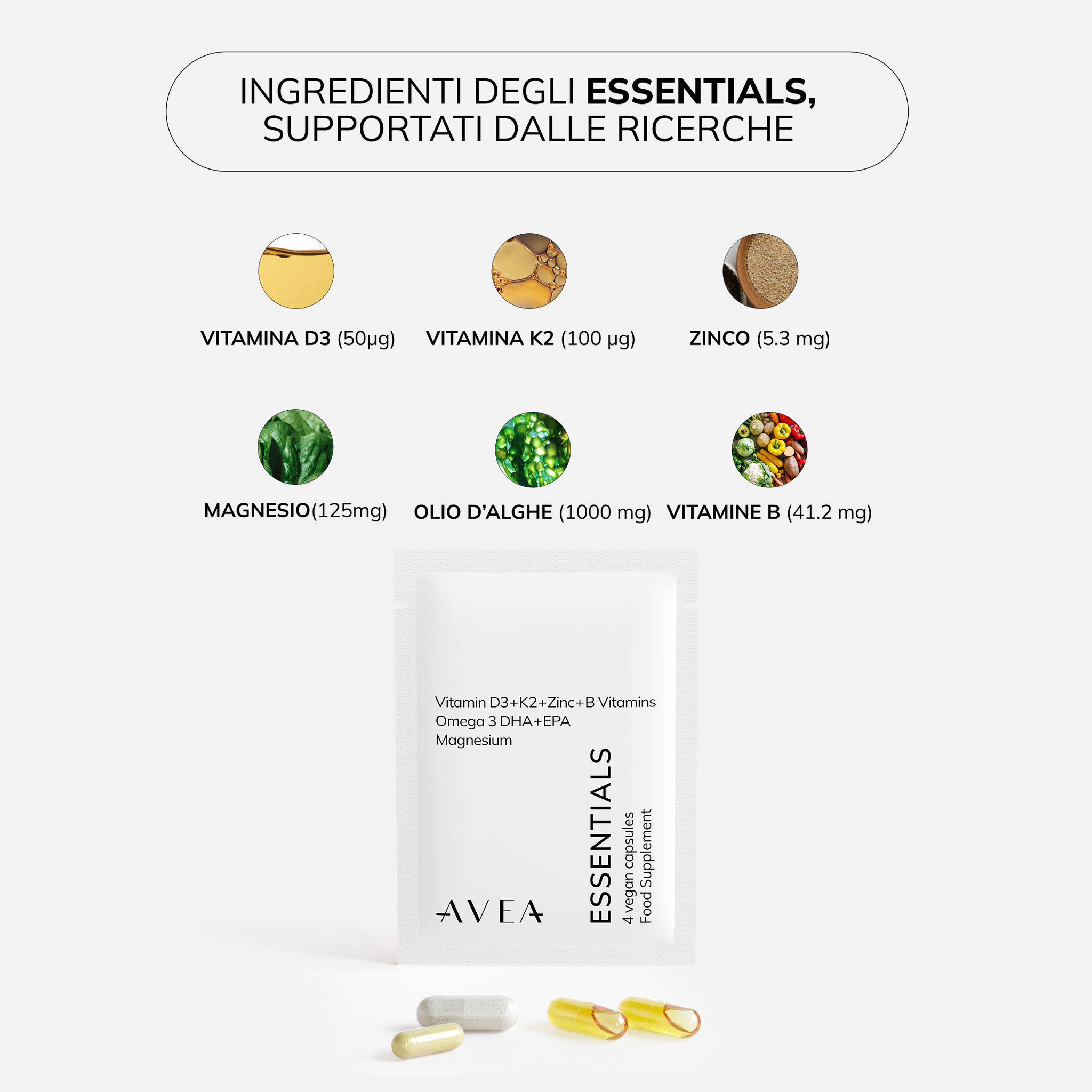 Gli Essentials di AVEA garantiscono il tuo apporto giornaliero di sei nutrienti fondamentali, in un pratico pacchetto adatto ai vegani.