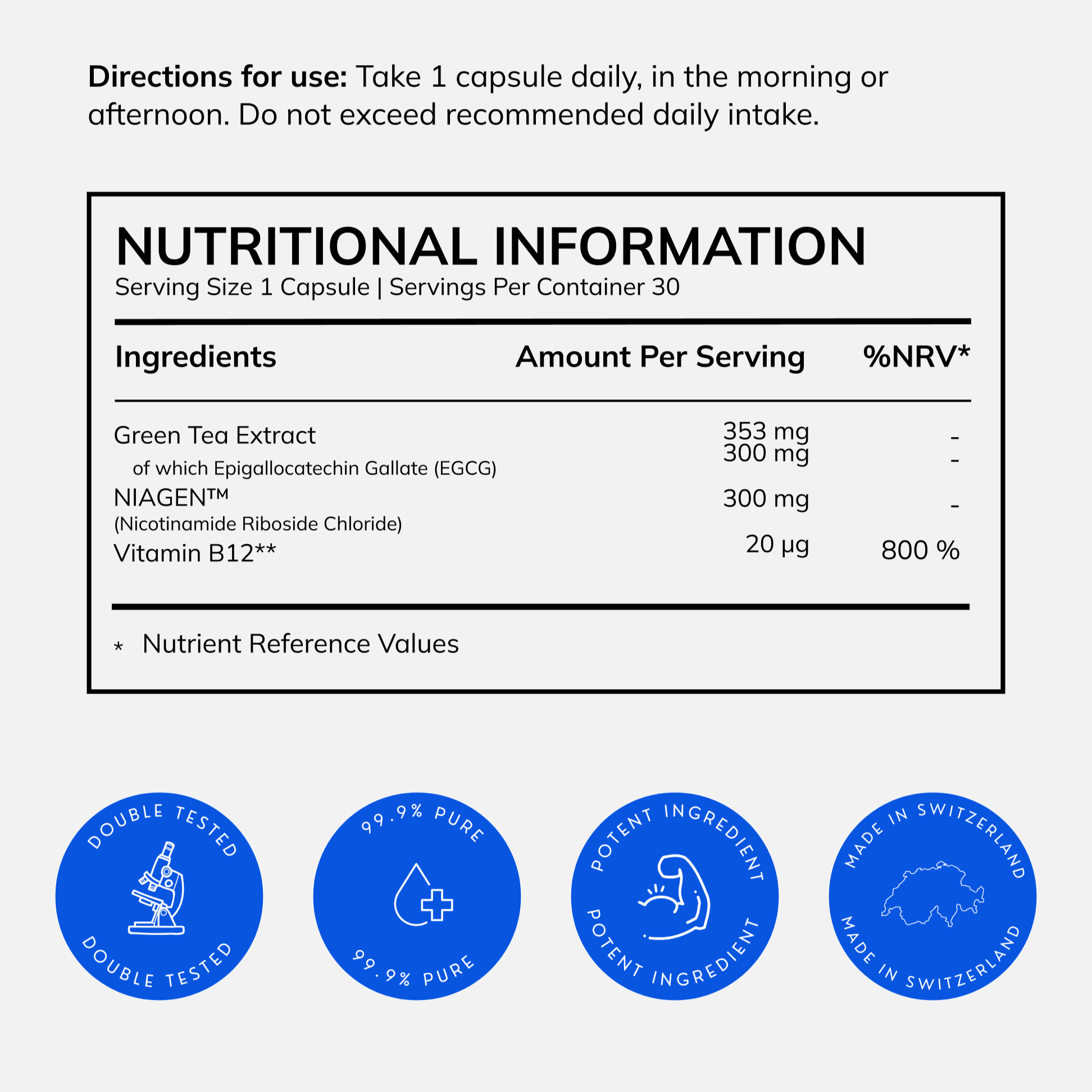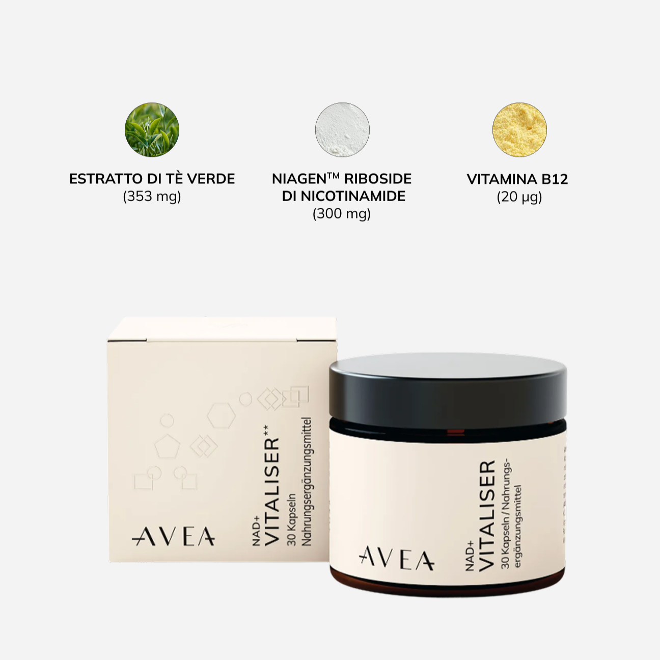 Il nostro NAD+ Vitaliser contiene 300 mg di NIAGEN™ (Nicotinamide Riboside), EGCG da tè verde e Vitamina B12, in una formula mirata per supportare energia, metabolismo e benessere cognitivo.