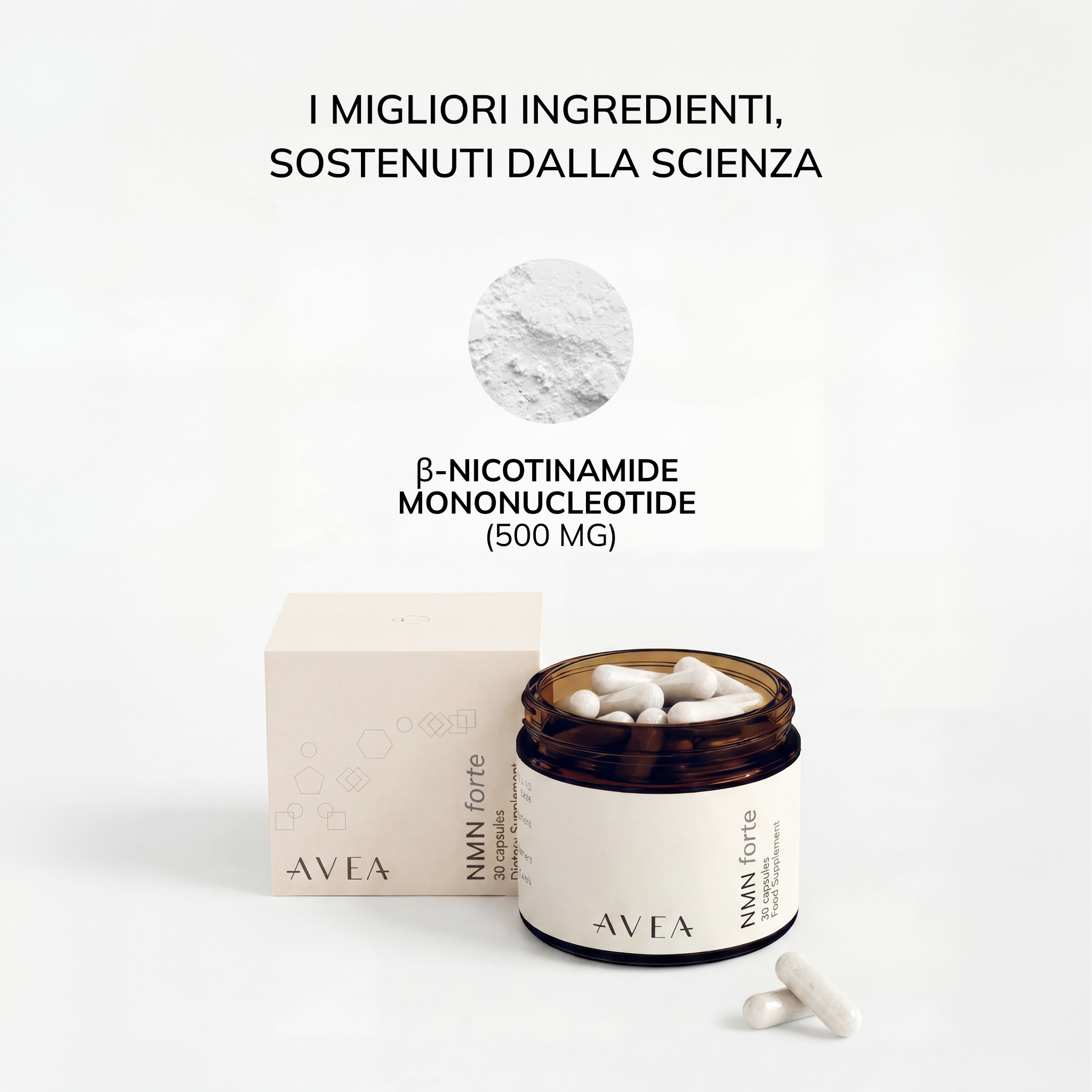 AVEA utilizza Longevir™ NMN, prodotto in Europa e doppiamente testato da un laboratorio svizzero indipendente per garantire purezza, stabilità e qualità ai massimi livelli.