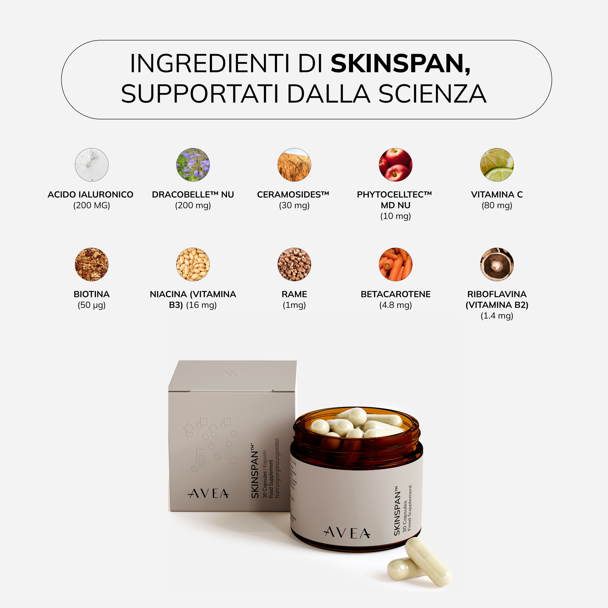 - SkinSpan™, la nostra formula clinicamente validata, è invece pensata per rinforzare la barriera cutanea, aumentare l’idratazione e sostenere il rinnovamento cellulare, proteggendo la pelle dai segni visibili della perdita di collagene e dell’invecchiamento prima che compaiano.