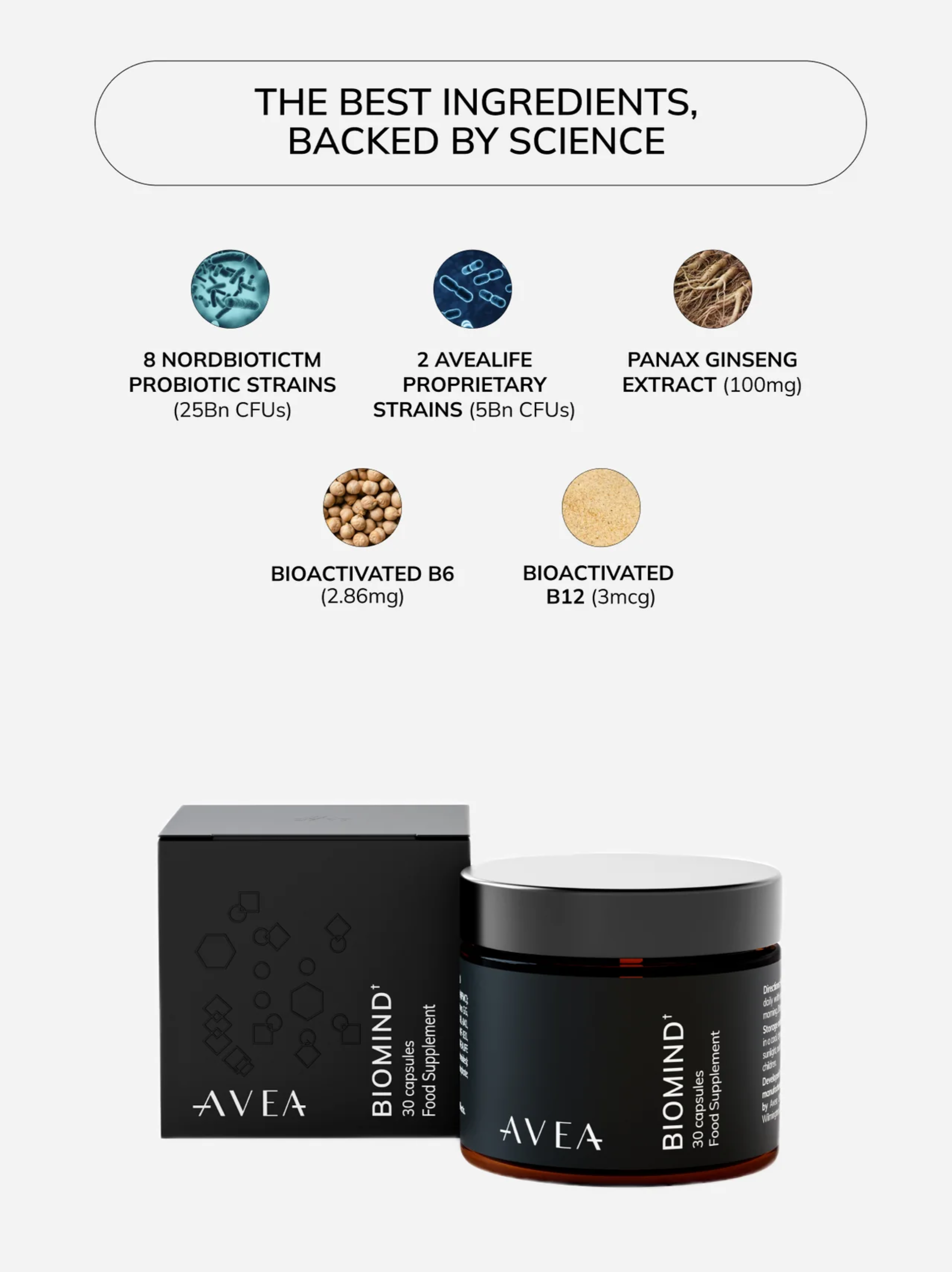 10 clinically studied strains from Nordbiotic, 2 of which are proprietary Avea strains, chosen for gut, immune, and cognitive function.