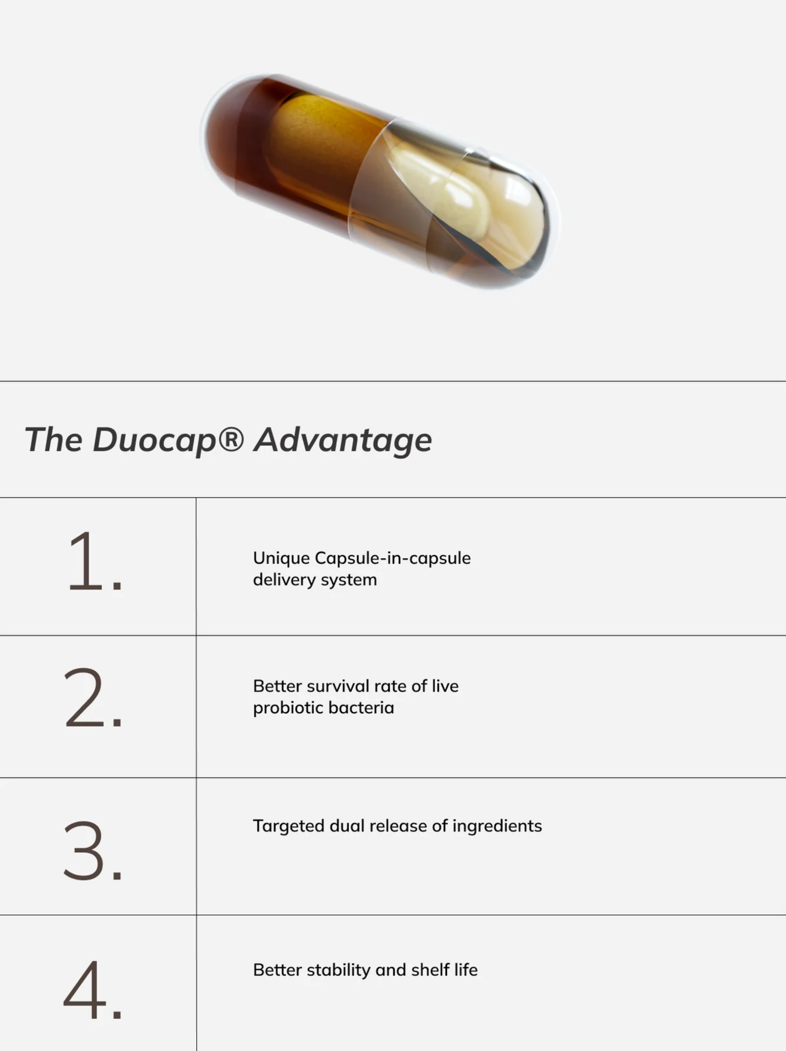 Balance your microbiome, reduce bloating, and enhance your mood with our advanced probiotic featuring Duocap® technology.