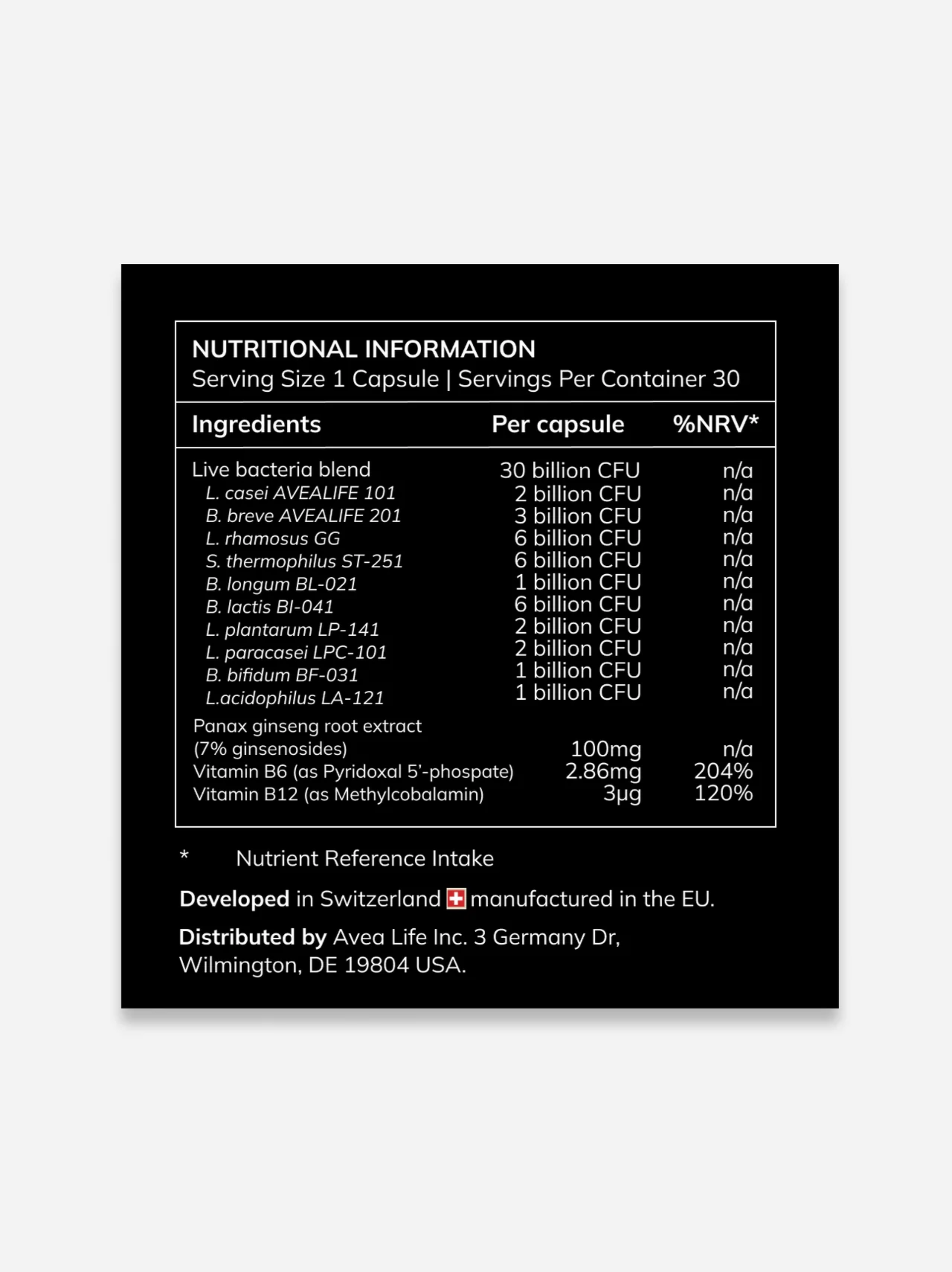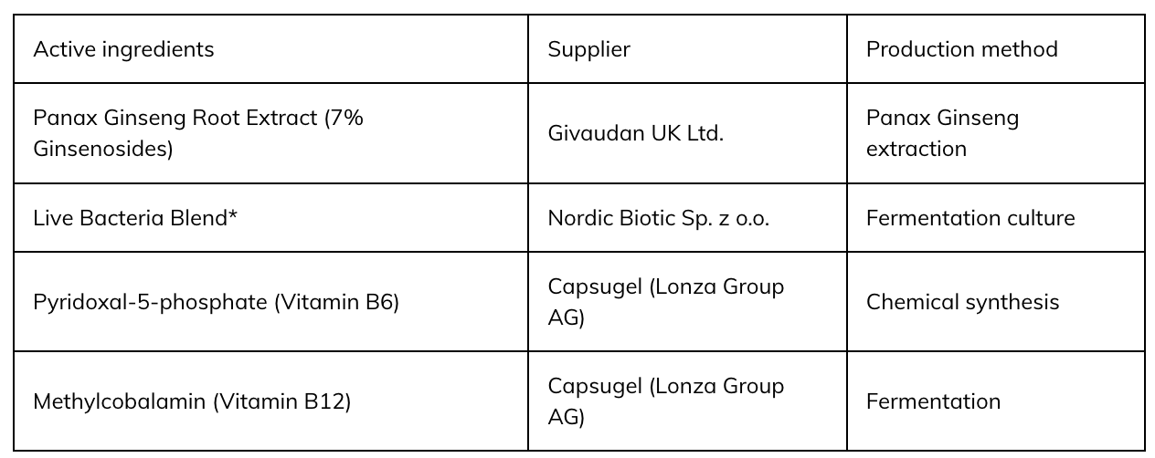 Live Bacteria Blend 30 Bn CFUs: (NORDBIOTIC™ (L. Rhamnosus GG, S. Thermophilus ST-251, B. Longum BL-021, B. Animalis ssp. lactis BL-041, L. Plantarum LP-141, L. Paracasei LPC-101, B. Bifidum BF-031, L. Acidophilus LA-121), B. Breve AVEALIFE 101, L. Casei AVEALIFE 201), Panax ginseng Root Extract (7% Ginsenosides) 100mg, Vitamin B6 (as Pyridoxal 5-phosphate) 2.86mg, Vitamin B12 (as Methylcobalamin) 3μg.