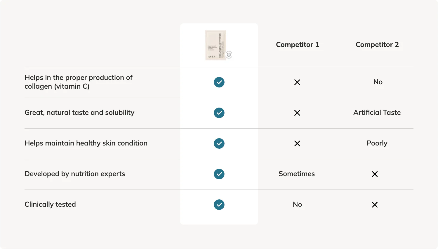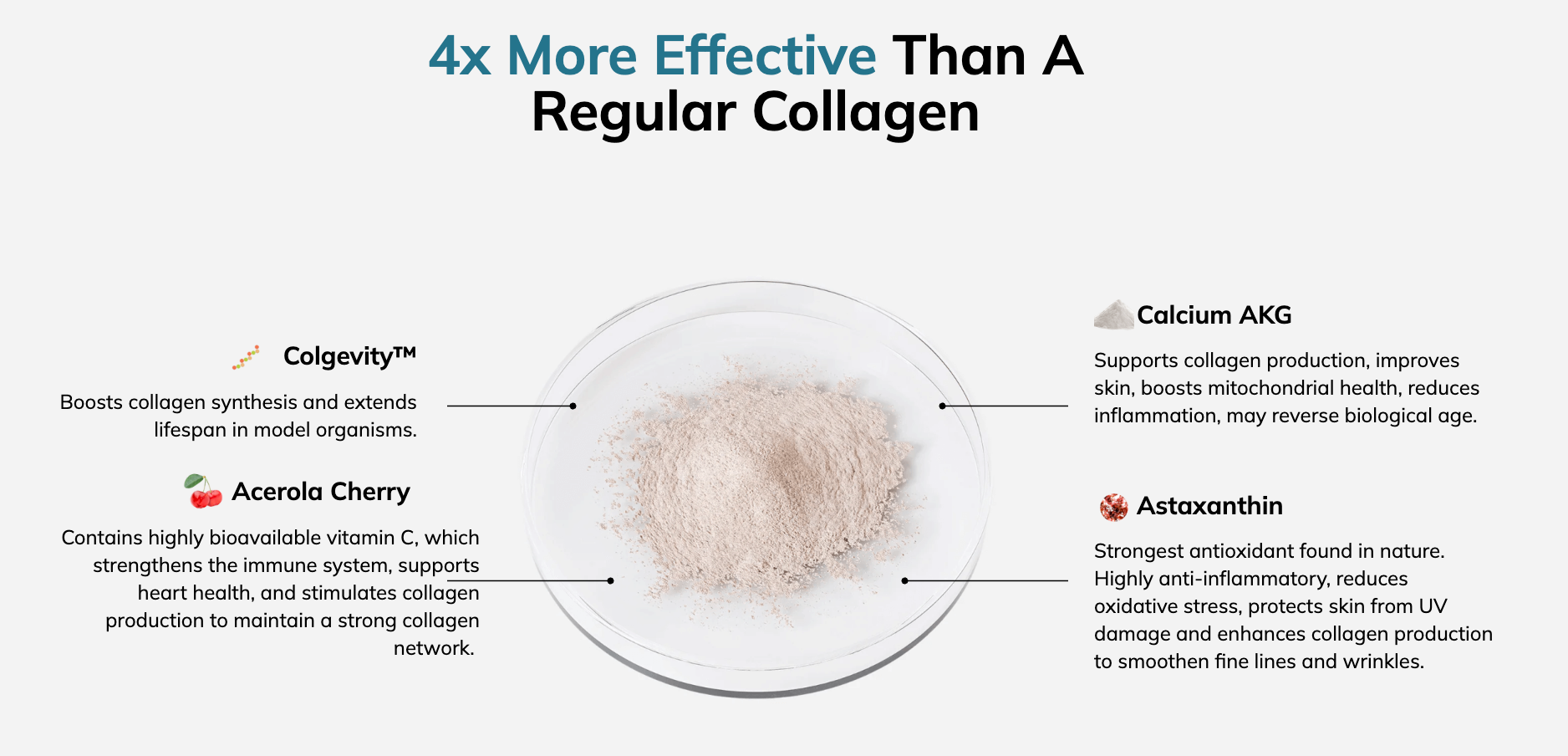 Avea has taken a new approach and worked with ETH Zurich scientists to develop Colgevity™. Instead of using whole collagen molecules—which are too large to be absorbed - we focus on highly bioavailable building blocks like proline, glycine, and hydroxyproline. These are directly used in the body to stimulate collagen turnover, making our blend 4x more effective than traditional collagen supplements.