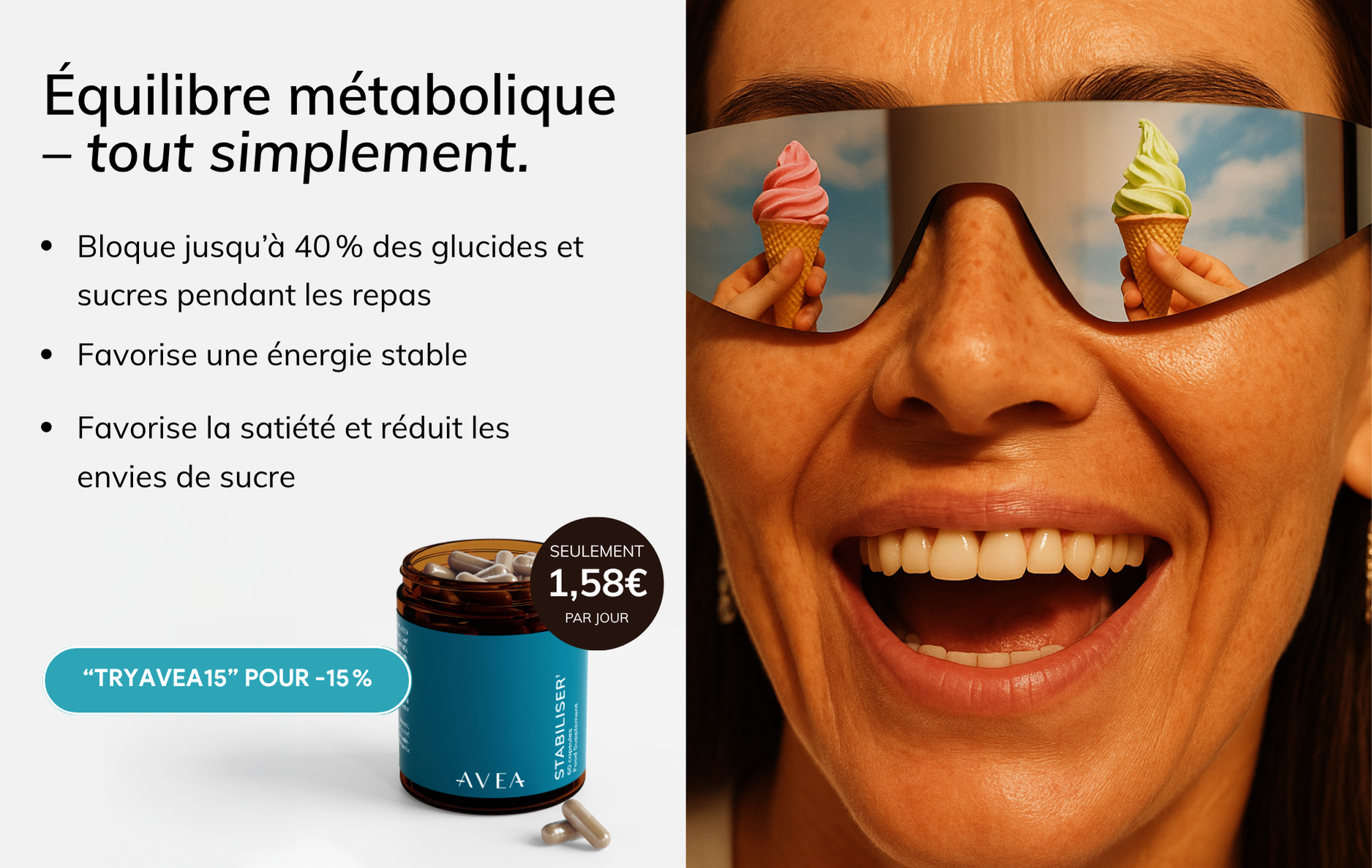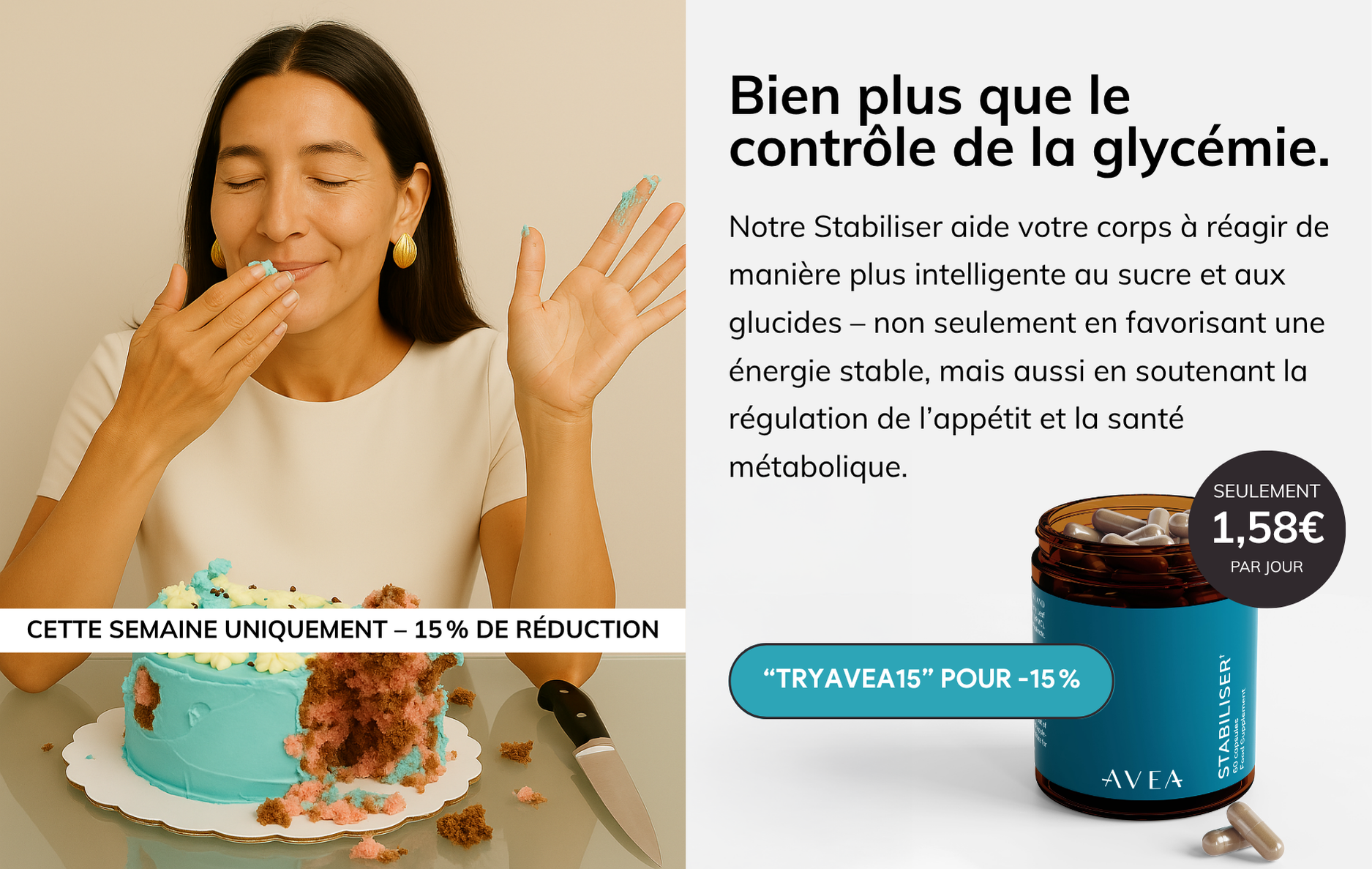 Équilibrez votre glycémie sans sacrifier le plaisir. Le Stabiliser d'AVEA vous permet de savourer ce que vous aimez, tout en gardant le contrôle de votre énergie, de votre concentration et de votre appétit.