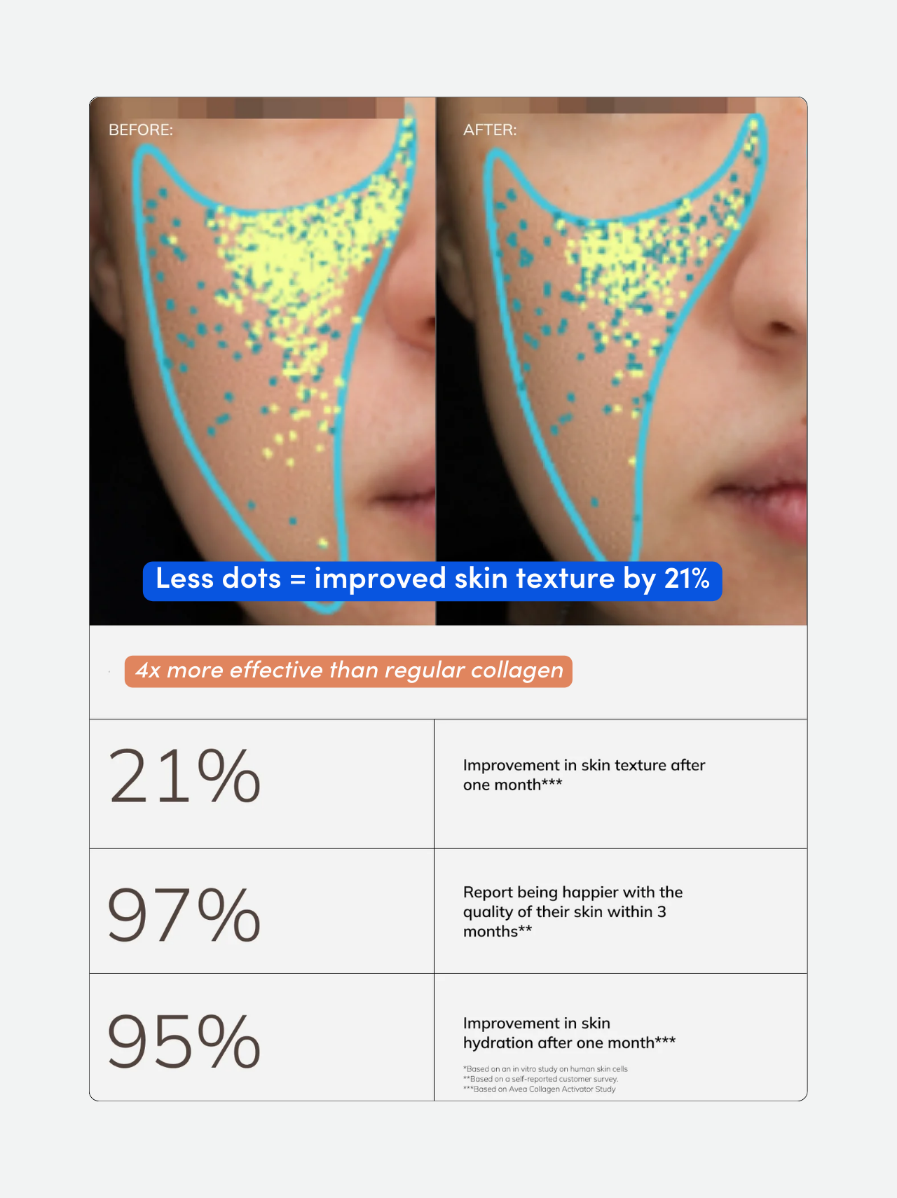 The research showed that a precise vegan amino acid blend stimulates collagen production up to 4× more effectively than traditional collagen peptides, and revealed that collagen synthesis depends on specific building blocks in a specific pattern, and not on consuming whole collagen proteins.