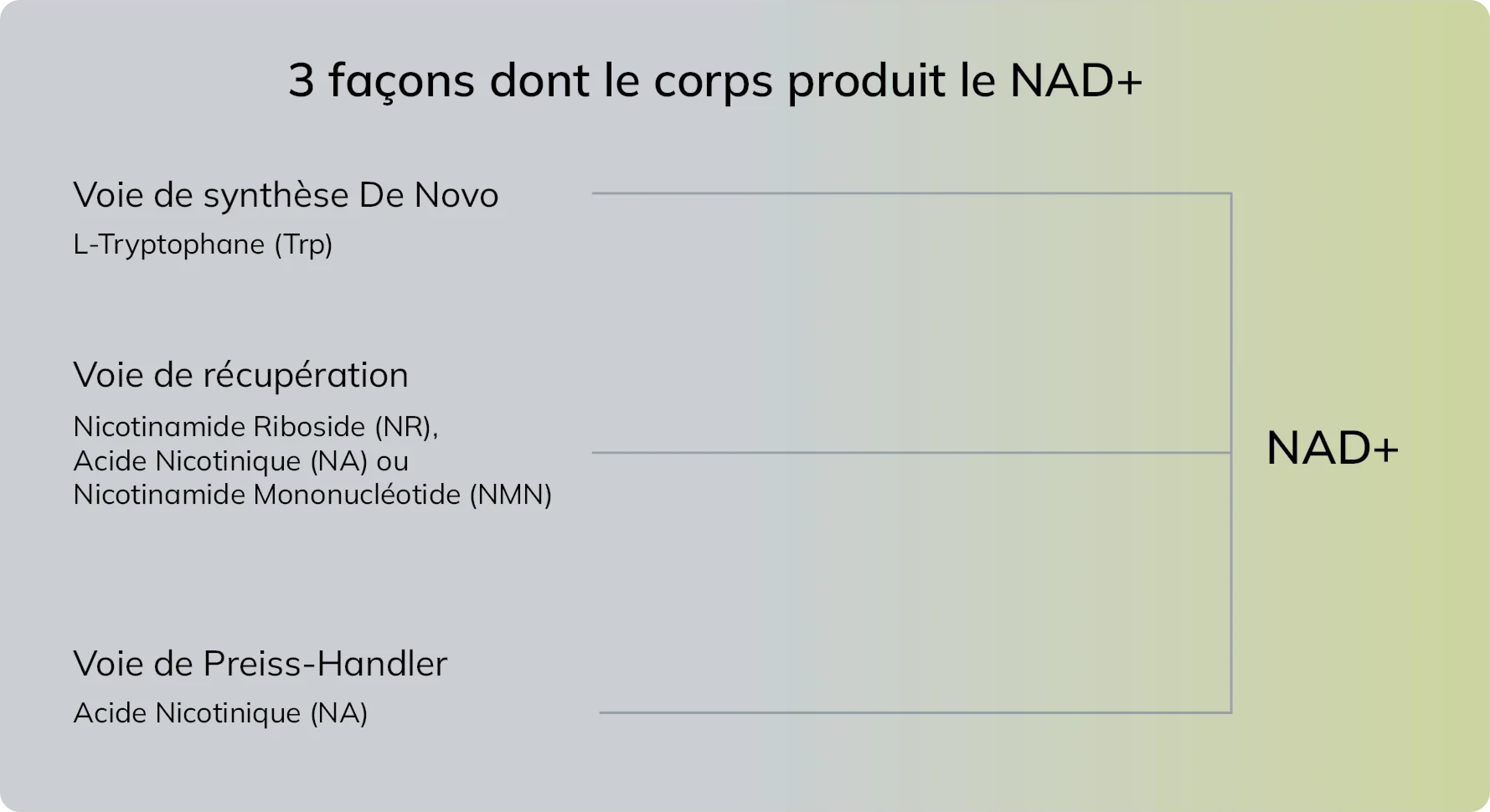 Le NMN et le NR sont des précurseurs directs du NAD+, naturellement présents dans de nombreux aliments et dans notre corps. Ces molécules agissent comme des blocs de construction, permettant la production de NAD+ par des voies métaboliques une fois consommées.