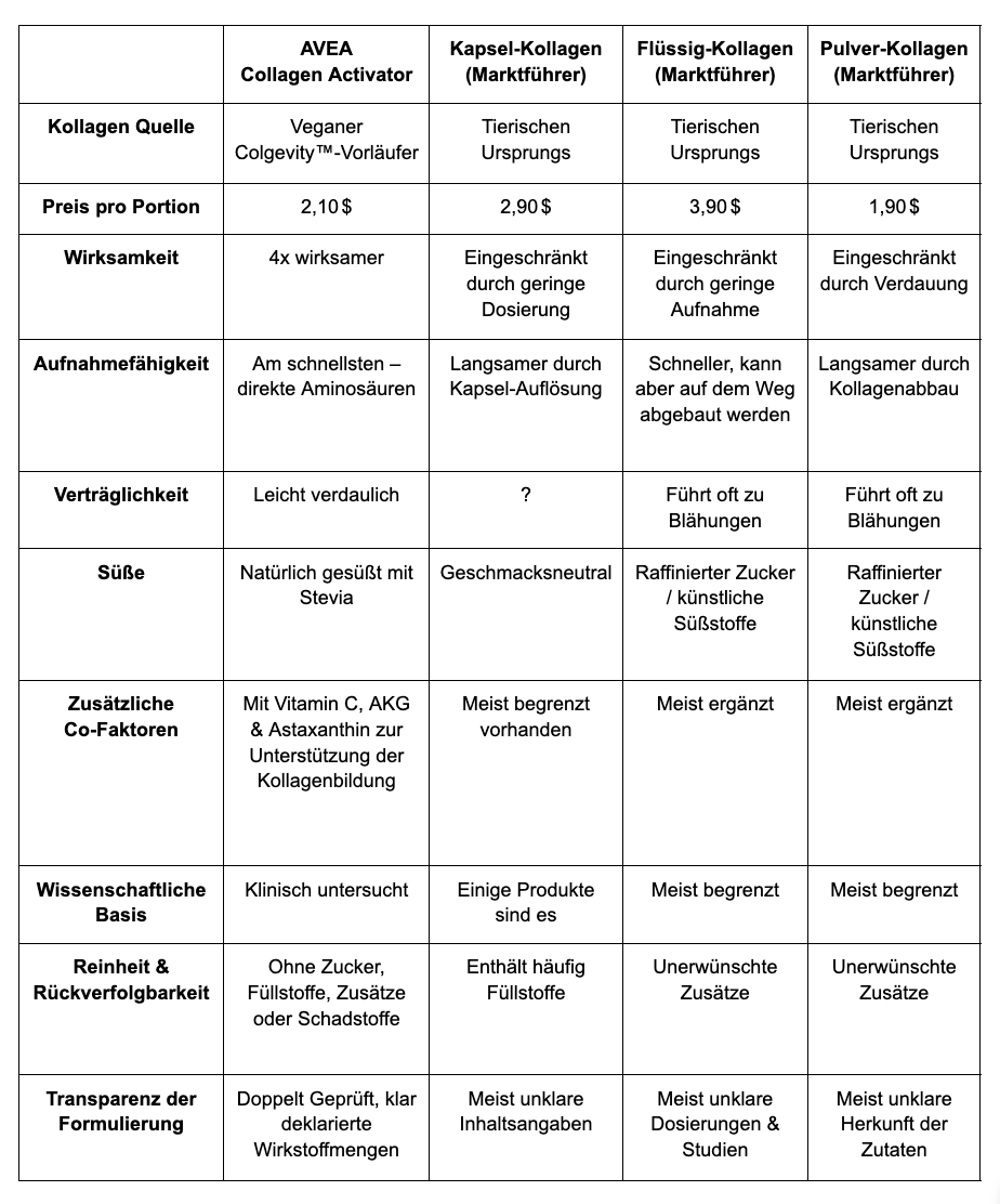 Während viele Kollagenprodukte noch immer auf tierische Quellen wie Rinder oder Meereskollagen setzen, bietet der AVEA Collagen Activator eine 100 % pflanzliche, effektive Alternative.