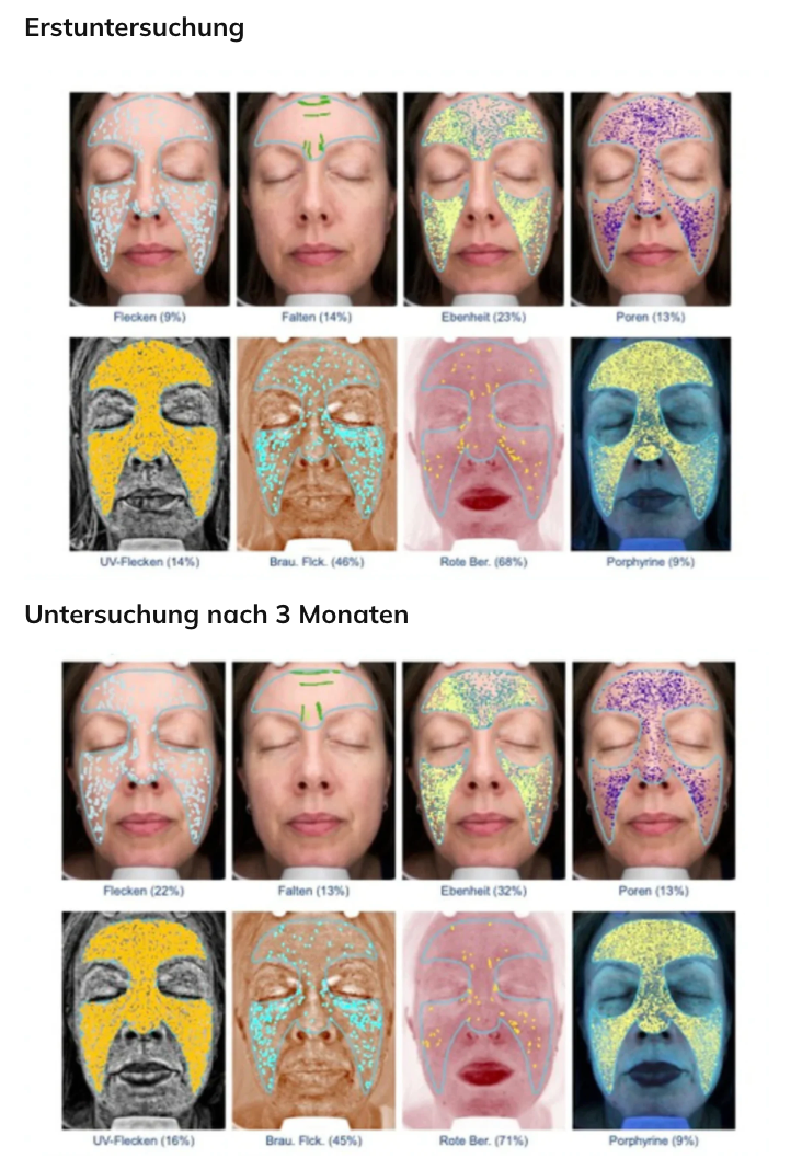 • Rötungen (Entzündungen): Anfangs um 11,8 % reduziert, nach drei Monaten weitere Verbesserung auf 4,4 %.