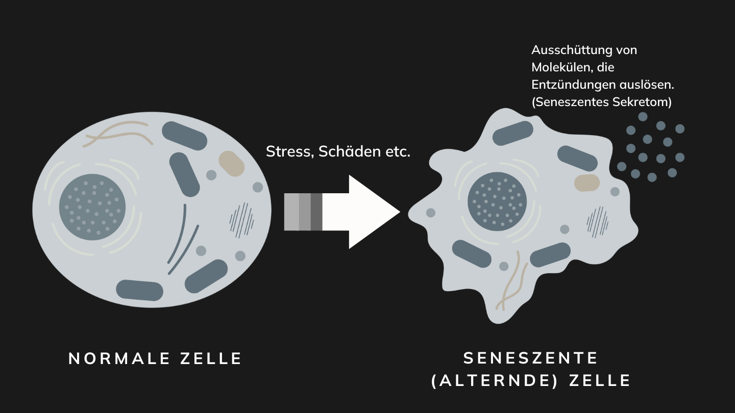 Wenn Zellen beschädigt werden, kommt es zur zellulären Seneszenz – ein natürlicher Abwehrmechanismus, der verhindert, dass fehlerhafte Zellen sich weiter teilen und potenziellen Schaden (wie Krebs) verursachen.
