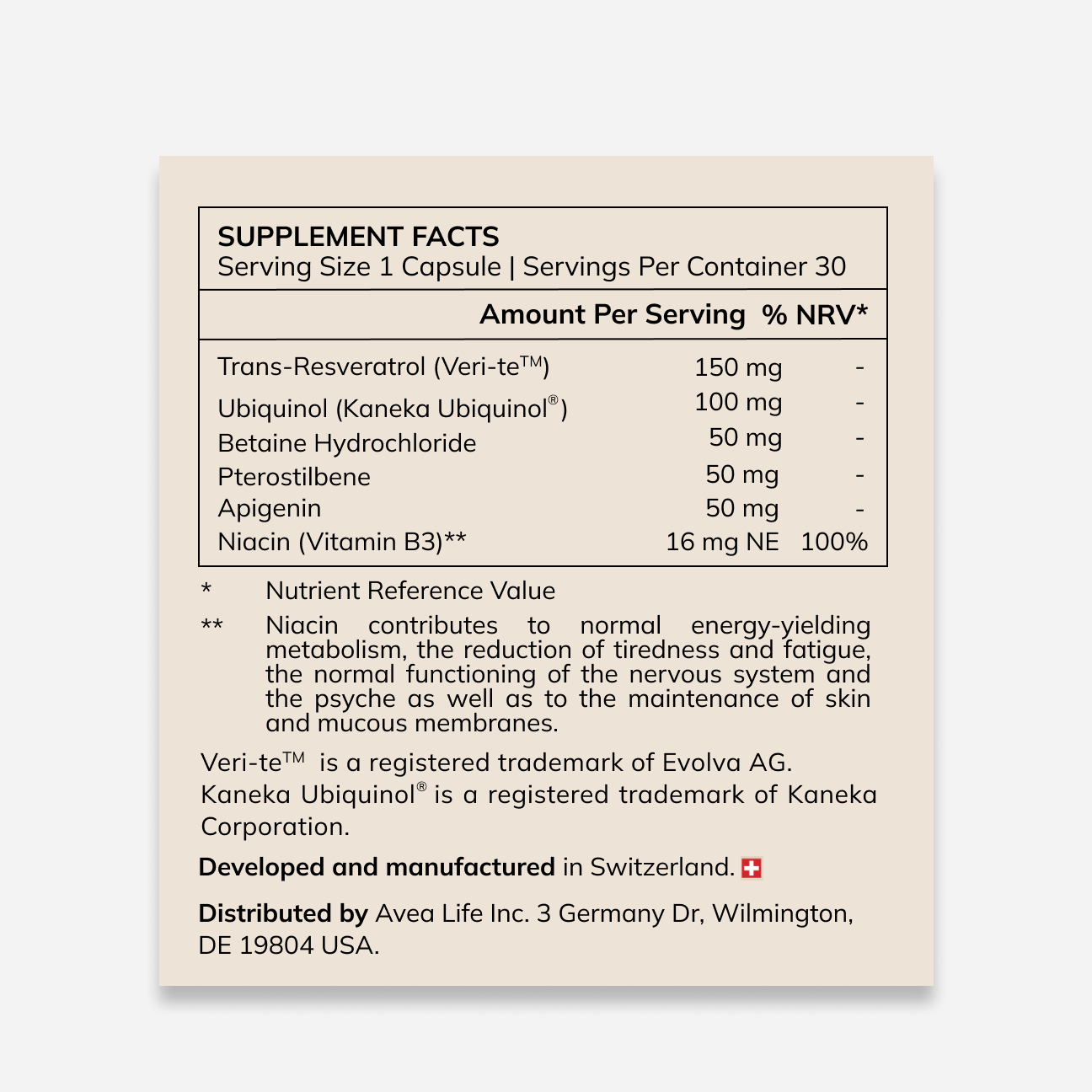 Active ingredients: Veri-te™ Trans-Resveratrol 150mg, Kaneka Ubiquinol® (Coenzyme Q10) 100mg, Betaine Hydrochloride 50mg, Pterostilbene 50mg, Apigenin 50mg, Nicotinamide (Vitamin B3) 16mg